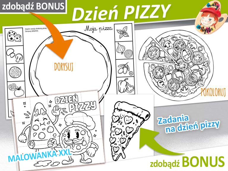 UWAGA BONUS na dzień PIZZY – karty pracy 9 stron + malowanka XXL (15xA4)